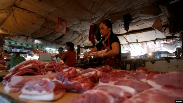 Quầy bán thịt heo trong một chợ ở Hà Nội. Photo courtesy: Reuters Tiếp cận Việt Nam là một lĩnh vực trọng tâm chính của các nhà sản xuất thịt lợn Hoa Kỳ.