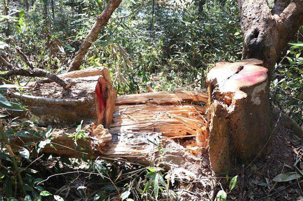 Gốc cây cổ thụ bị cưa hạ trong rừng đặc rụng Mường Phăng. Photo courtesy: baomoi.com
