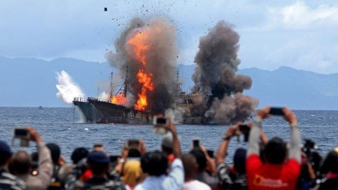 Giới chức Nam Dương cho nổ 81 tàu cá nước ngoài hôm 1.4. Photo Courtesy: Reuters Chính quyền trong nước đang xác minh chiếc “tàu lạ” đã đâm chìm một tàu cá Việt Nam khiến 1 người mất tích.