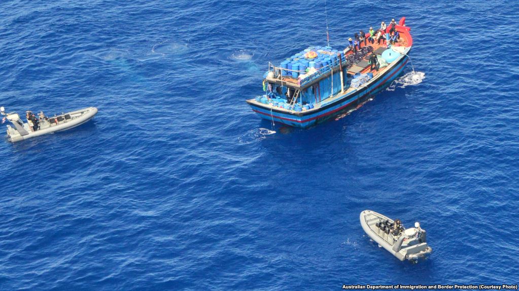 Một tàu đánh cá Việt Nam bị cho là đánh bắt bất hợp pháp bị lực lượng chức năng bao vây gần bãi đá ngầm Saumarez trong Khu bảo tồn biển Coral Sea của Úc. Photo Courtesy: Bộ Di trú và Bảo vệ Biên giới Úc