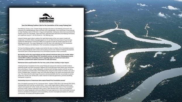 Thông cáo báo chí của Liên minh cứu sông Mekong hôm 8/10/2019 và cảnh dòng sông Mekong nhìn từ trên cao xuống. Photo courtesy: RFA Liên minh cứu sông Mekong (Save the Mekong) hôm 8/10 ra thông cáo báo chí thúc giục chính phủ Việt Nam xem xét lại việc tham gia xây dựng đập thủy điện Luang Prabang ở Lào vì những lo ngại do các ảnh hưởng tiêu cực của đập thủy điện đối với dòng sông.