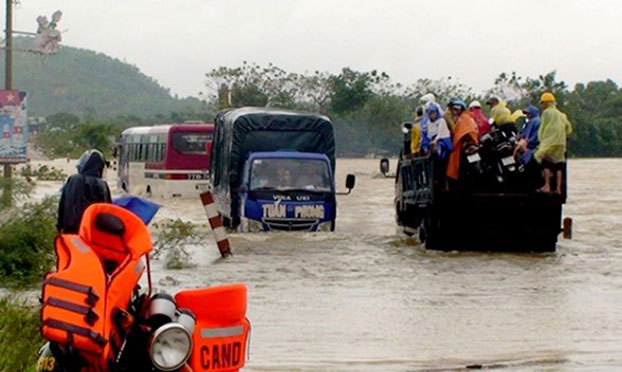 Mưa lũ gây ngập sâu nhiều tuyến đường tại tỉnh Bình Định hôm 4/11/2016. Photo courtesy: zing Mưa lũ tại khu vực các tỉnh miền Trung Việt Nam trong 4 ngày qua đã khiến 5 người chết vì nước cuốn trôi và 8 người mất tích.