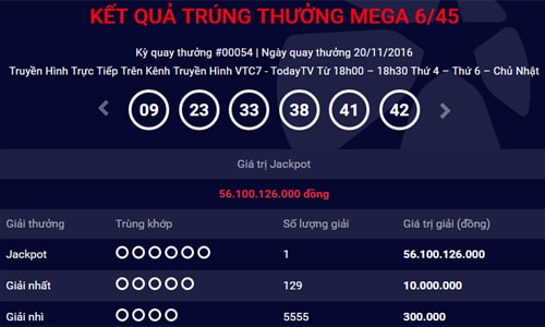 Kết quả trúng thưởng vé số Mega 6/45 ngày 20-11 Tối 20-11, Công ty Xổ số điện toán Việt Nam (Vietlott) công bố thêm một người trúng giải độc đắc (Jackpot) 56 tỉ đồng thuộc kỳ quay số mở thưởng lần 54 vào chiều cùng ngày.