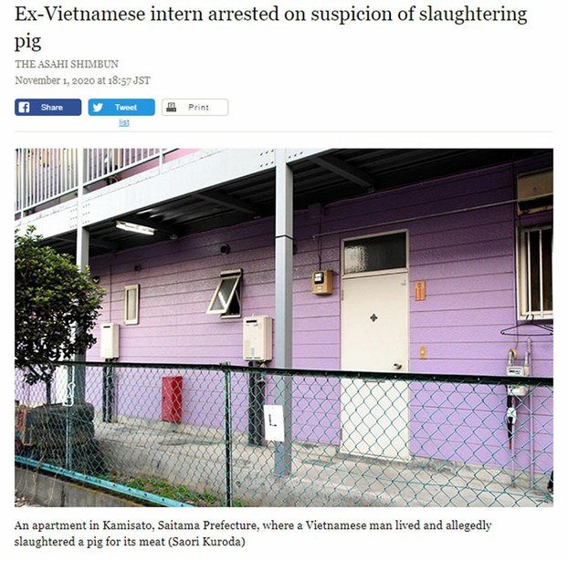 The Asahi Shimbun, ngày 1/11/2020, loan tin một cựu thực tập sinh Việt Nam bị bắt giữ vì giết mổ heo trái phép tại Nhật. Photo courtesy: asahi.com Một thanh niên Việt Nam vừa bị cảnh sát tỉnh Saitama, Nhật Bản bắt giữ, với lý do nghi giết mổ heo trái phép tại nhà.
