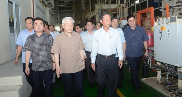 Nguyễn Phú Trọng (thứ 3 từ trái) đến thăm công ty cổ phần Gỗ MDF VRG Kiên Giang trong khu công nghiệp Thạnh Lộc, H. Châu Thành, chiều ngày 13 Tháng Tư, 2019. Ảnh: Báo Thanh Niên