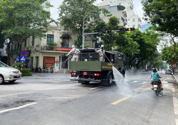 Phun hóa chất diệt khuẩn trên đường phố Hà Nội hôm 26/7/2021. Photo courtesy: Reuters