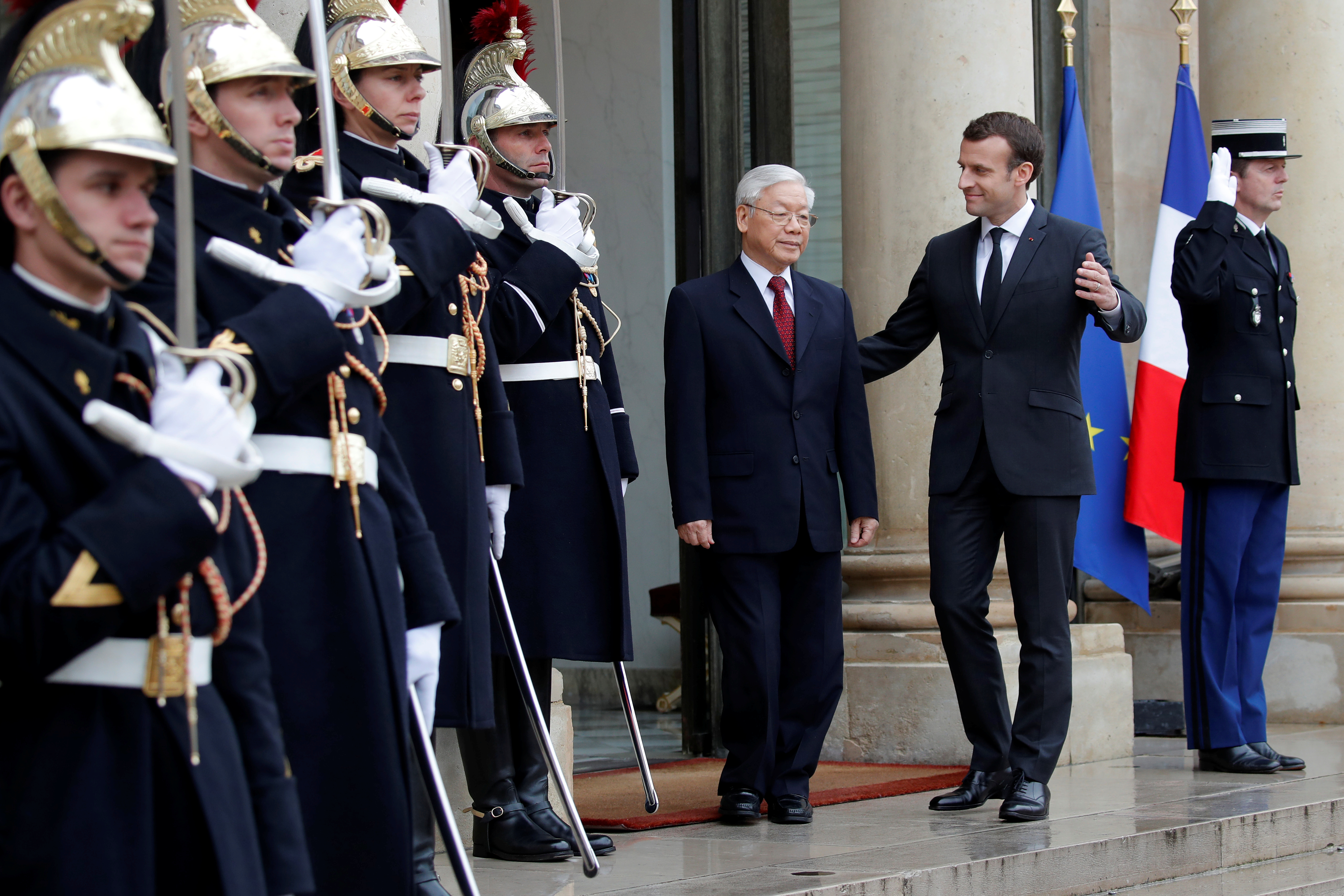 Tổng bí thư ĐCS Việt Nam Nguyễn Phú Trọng được Tổng thống Pháp Emmanuel Macron đón tại Paris. Photo Courtesy: Reuters Tập đoàn xây dựng Bouygues của Pháp vừa ký một hợp đồng trị giá 1.5 tỷ euro để giúp Việt Nam xây dựng và vận hành tuyến đường sắt đô thị ở thủ đô Hà Nội, theo thông cáo của phủ tổng thống Pháp ra hôm 27.3.