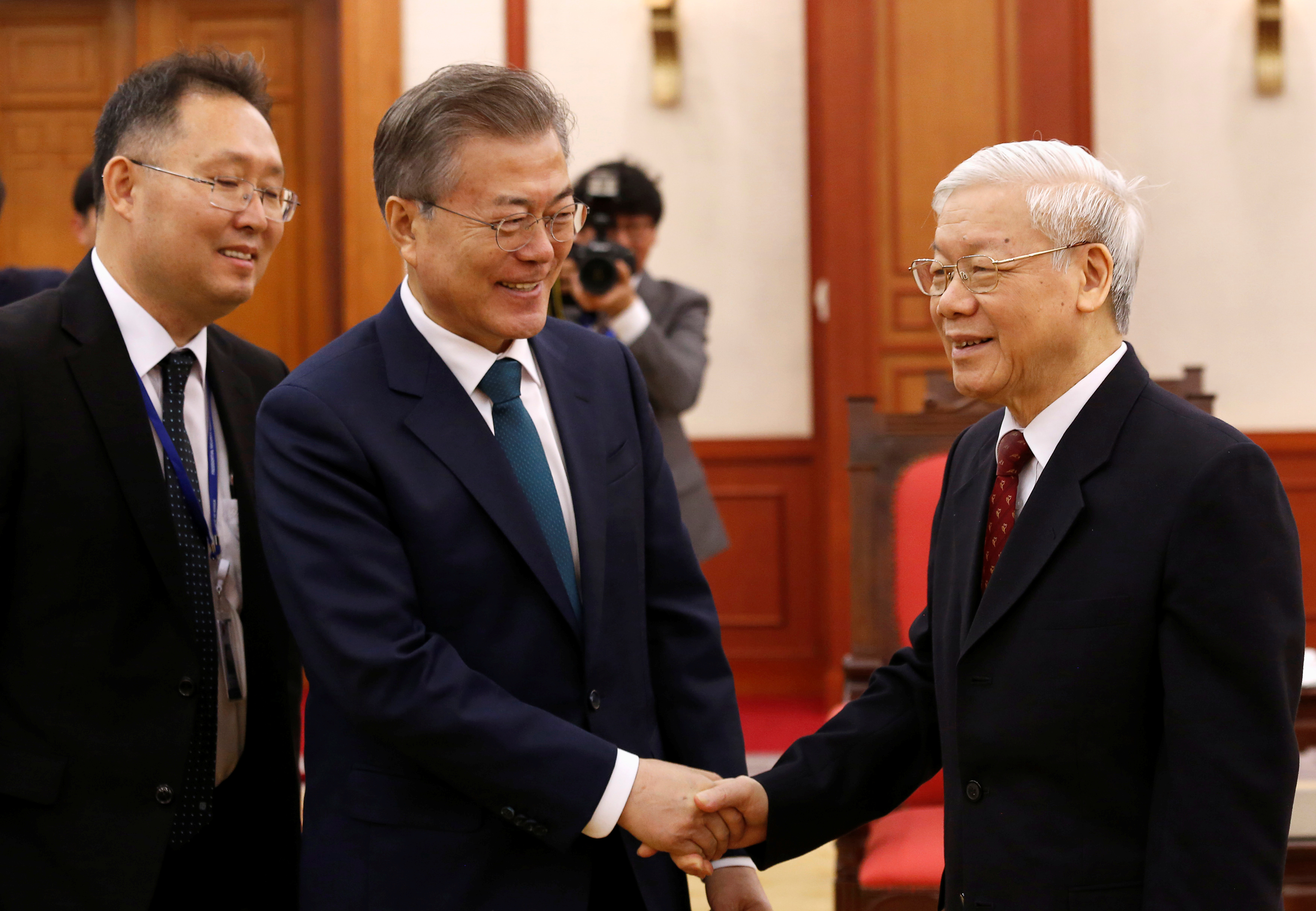 Tổng bí thư Đảng Cộng sản Việt Nam đón Tổng thống Hàn Quốc tại Hà nội ngày 23.3.2018. Photo Courtesy: Reuters