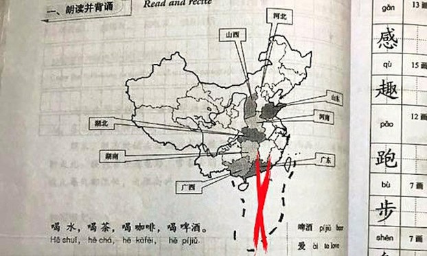 Hình minh hoạ. Bản đồ có hình lưỡi bò trong giáo trình dạy tiếng Trung ở trường Đại học Kinh doanh và Công nghệ Hà Nội. Photo courtesy: Tien Phong Một cuốn sach dạy tiếng Trung do Đại học Ngôn ngữ Bắc Kinh phát hành và được sử dụng ở trường Đại học Kinh doanh và Công nghệ Hà Nội sử dụng bản đồ có hình lưỡi bò tại Biển Đông. Truyền thông trong nước loan tin này hôm 2/11.