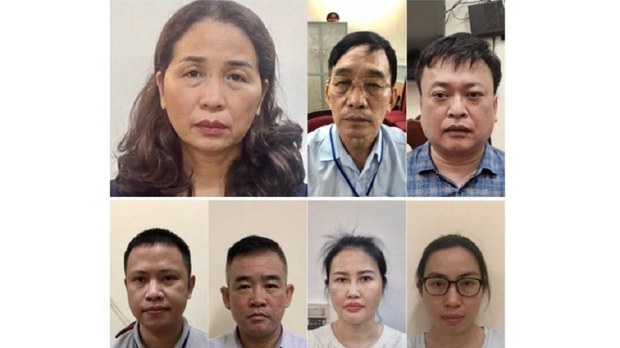 Bà Vũ Liên Oanh (hàng đầu tiên từ trái qua) cùng những người liên quan. Photo courtesy: BCA Cựu Giám đốc Sở Giáo dục và Đào tạo (GD&ĐT) tỉnh Quảng Ninh cùng hàng chục người khác đã bị công an bắt tạm giam với cáo buộc tội vi phạm quy định về đấu thầu gây hậu quả nghiêm trọng.