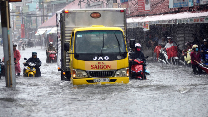 Mưa đổ xuống vào gần 14 giờ, nặng hạt ở khu vực quận Bình Thạnh, Gò Vấp, Thủ Đức… Một số tuyến đường như Nguyễn Hữu Cảnh, Võ Văn Ngân, Tô Ngọc Vân… nước dâng cao khoảng 40 cm khiến hàng loạt xe chết máy. Nhiều người đi xe máy tìm cách di chuyển lên lề đường để tránh ngập khiến giao thông tại một số khu vực trở nên hỗn loạn.
