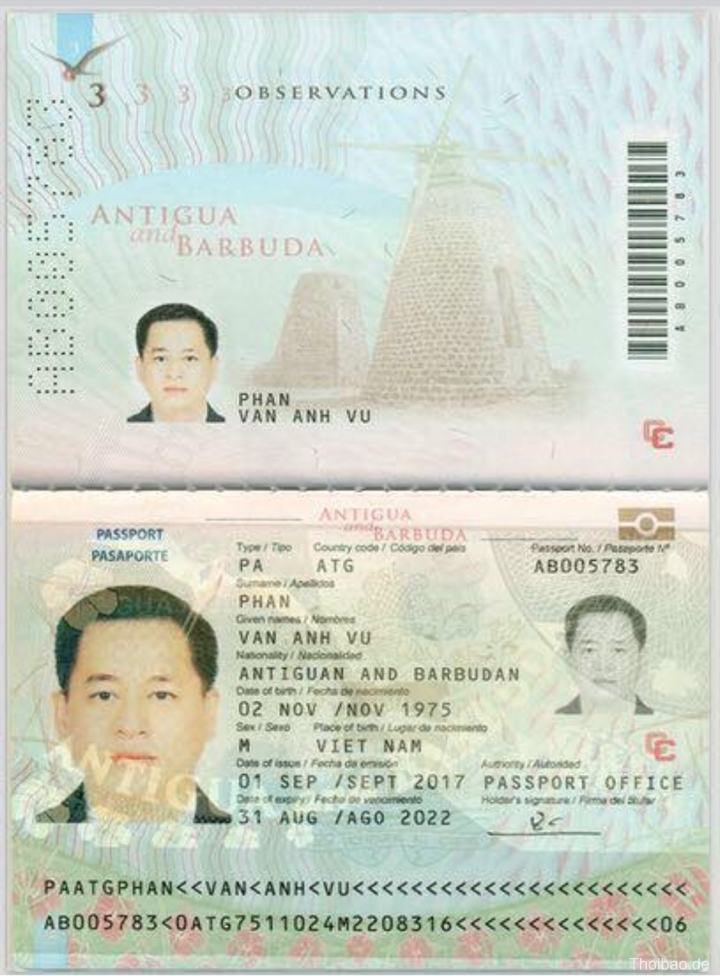 ông Phan Văn Anh Vũ còn có một hộ chiếu mang Quốc tịch của Quốc đảo Antigua và Barbuda ở Caribê. Photo Courtesy: Thoibao.de