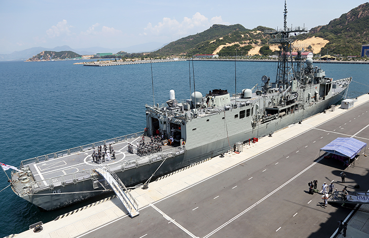Tàu HMAS Newcastle cập cảng Cam Ranh. Ảnh: Xuân Ngọc Hôm 7.5, hai tàu chiến HMAS Newcastle và HMAS Canberra của Hải quân Hoàng gia Australia cùng hơn 800 thủy thủ đã đến vịnh Cam Ranh tỉnh Khánh Hòa bắt đầu thực hiện chuyến thăm Việt Nam 4 ngày.