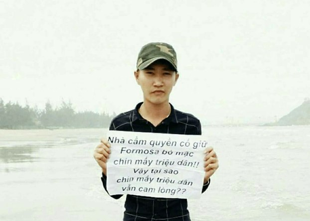 Hình minh họa. Anh Phan Công Hải và tấm biển phán đối công ty Formosa gây ô nhiễm biển miền Trung. Photo courtesy: FB Người Việt Xấu Xí Anh Phan Công Hải sinh năm 1996 ở Nghệ An vừa bị cơ quan An ninh điều tra Việt Nam bắt giữ hôm 19/11/2019 ở Hà Tĩnh với cáo buộc “phát tán tài liệu nhằm chống nhà nước” theo điều 117 Bộ luật hình sự 2015.