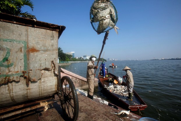 Hình minh hoạ. Công nhân vệ sinh vớt cá chết trên hồ Tây bị ô nhiễm ở Hà Nội hôm 3/10/2016. Photo courtesy: Reuters Truyền thông trong nước hôm 21/8 cho biết Thanh tra Hà Nội đã đột ngột thay đổi những kết luận thanh tra về những sai phạm trong việc mua, quản lý và sử dụng chế phẩm Redoxy-3C để xử lý các hồ ở Hà Nội từ có thành không.