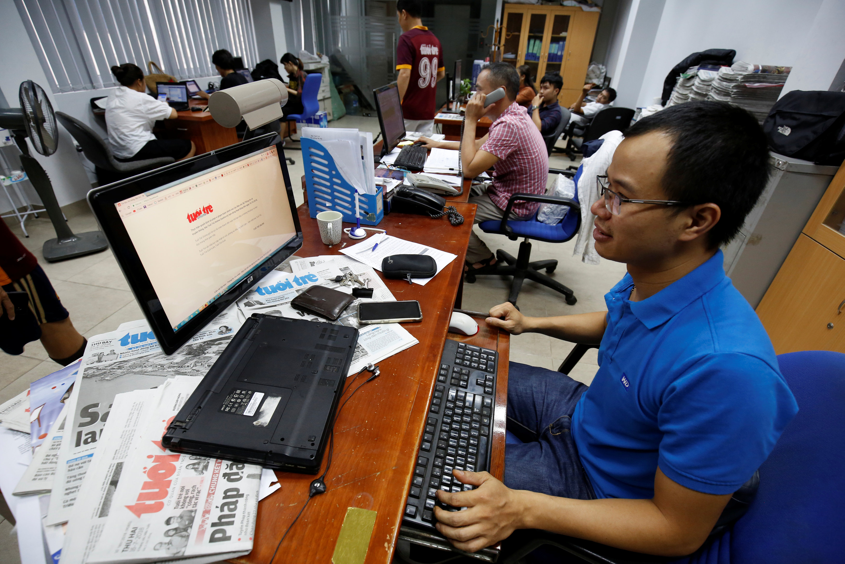 Một nhà báo bên cạnh màn hình chiếu lại trang chính của tờ Tuổi Trẻ bị “chết lâm sàng” trong ba tháng. Photo Courtesy: Reuters Sau Tuổi Trẻ Online, một báo điện tử khác của Việt Nam mới bị phạt vì thông tin “sai sự thật”, “gây ảnh hưởng rất nghiêm trọng”, liên quan tới Chủ tịch Trần Đại Quang và Luật Biểu tình.
