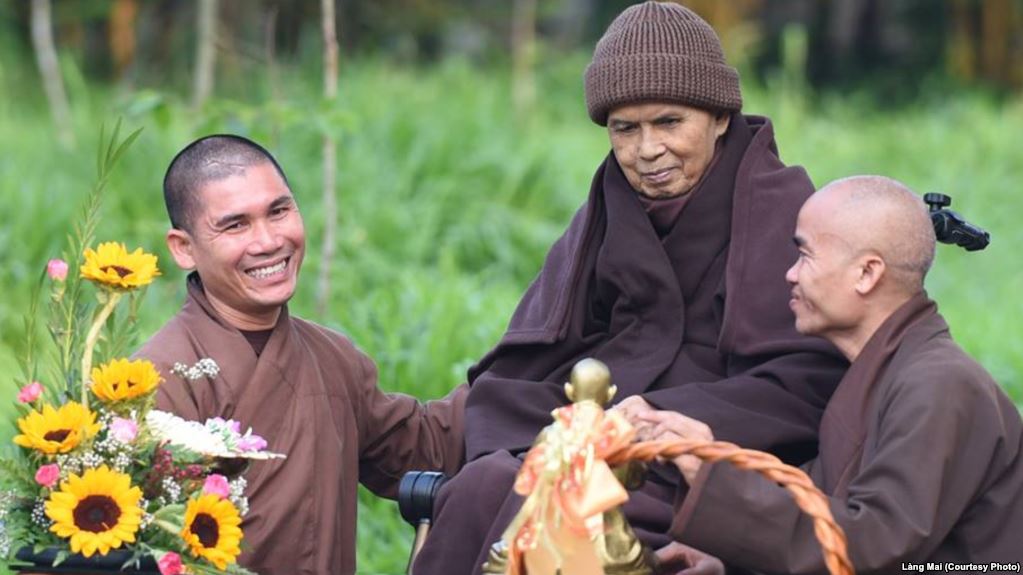Thiền sư Thích Nhất Hạnh (giữa) và các tăng ni. Photo courtesy: Làng Mai Thiền sư Thích Nhất Hạnh hôm 28/10 đã trở về nơi ông xuất gia năm 16 tuổi ở Thừa Thiên Huế để tĩnh dưỡng, hai ngày sau khi bay từ Bangkok tới Đà Nẵng.