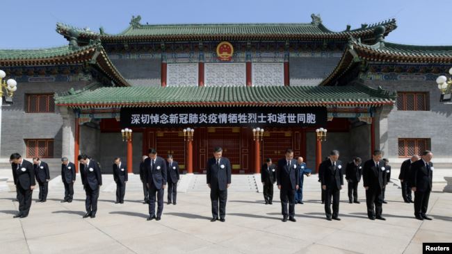 Các nhà lãnh đạo Trung Quốc bao gồm Chủ tịch Tập Cận Bình đứng mặc niệm trong khi cả nước để tang những người chết vì dịch virus corona, tại trụ sở quyền lực chính trị ở Trung Nam Hải, Bắc Kinh, ngày 4 tháng 4, 2020.. Photo courtesy: Reuters Trung Quốc ngày thứ Bảy tưởng niệm hàng ngàn người chết trong dịch virus corona mà nước này gọi là “liệt sĩ,” treo cờ rũ trên khắp cả nước và đình chỉ mọi hình thức giải trí.