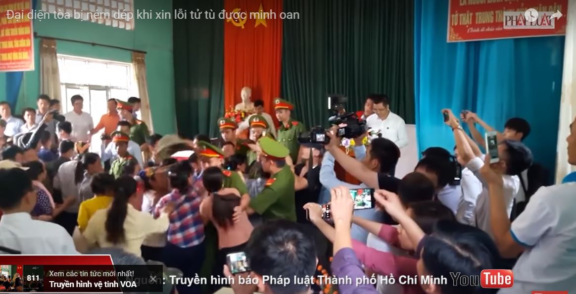 Hình cắt từ clip. Photo Courtesy: Youtube Một đại diện Tòa án Cấp cao mới đây đã bị phản đối và bị ném dép khi xin lỗi công khai một tử tù được minh oan ở tỉnh Bắc Giang.