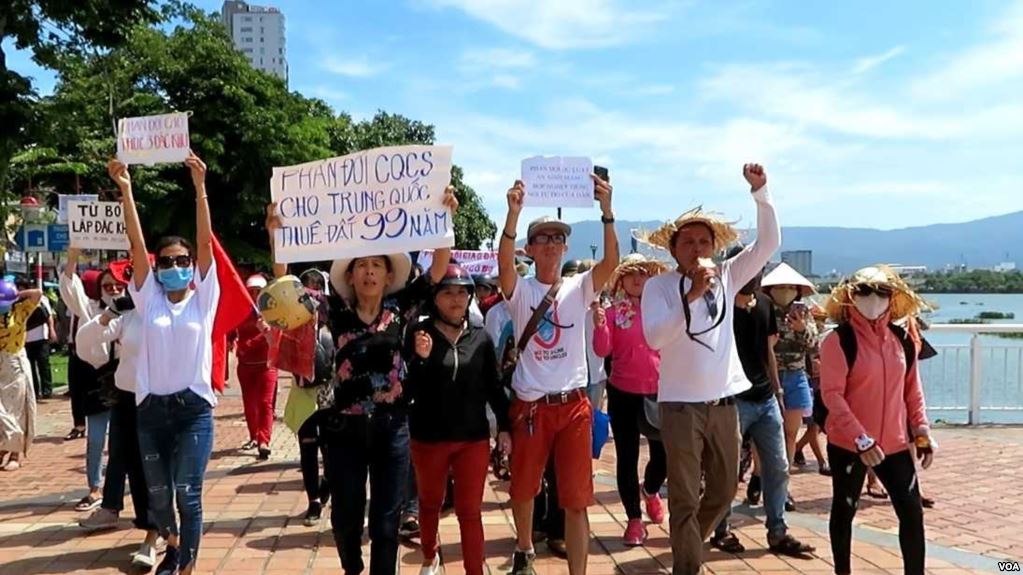 Nhóm đi đầu trong cuộc biểu tình lúc sáng Chủ Nhật, 10 tháng Sáu. Photo Courtesy: VOA Nhiều ngàn người xuống đường đồng loạt tại nhiều nơi ở Việt Nam để phản đối dự luật đặc khu và dự luật an ninh mạng vào sáng ngày Chủ Nhật, 10 tháng Sáu.