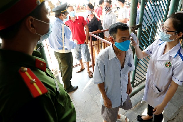 Hình minh hoạ. Nhân viên y tế đo thân nhiệt người đi xem một trận đấu bóng đá ở giải V. League hôm 5/6/2020. Photo courtesy: Reuters