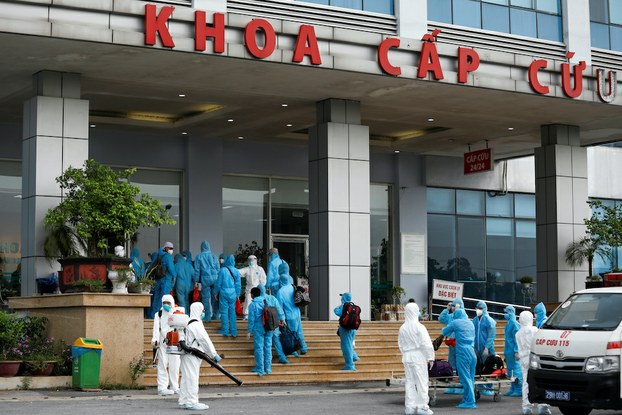 Hình minh hoạ. Những công nhân Việt Nam mặc đồ bảo vệ màu xanh nhiễm COVID-19 đến Bệnh viện các bệnh nhiệt đới ở Hà Nội hôm 29/7/2020 sau khi về từ Guinea Xích Đạo. Photo courtesy: Reuters