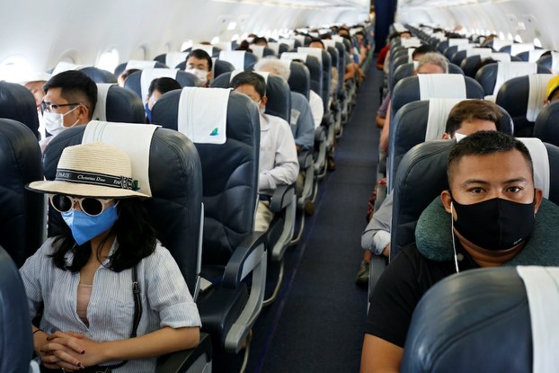 Hình minh hoạ. Hành khách đeo khẩu trang trên một chuyến bay của Bamboo Airways từ Đà Nẵng đi Hà Nội hôm 7/3/2020. Photo courtesy: Reuters Tính đến tối ngày 16 tháng 3, Việt Nam báo cáo tổng ca nhiễm COVID- 19 trong nước là 59 trường hợp.