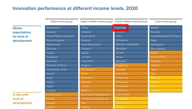 Theo đó, WIPO phân tích các nước đổi mới nhất trong từng nhóm thu nhập của Ngân hàng Thế giới (WB), dựa trên dữ liệu từ Chỉ số Đổi mới Toàn cầu (GII) của WIPO; từ đó, đưa ra thứ tự trong bảng xếp hạng năm 2020.