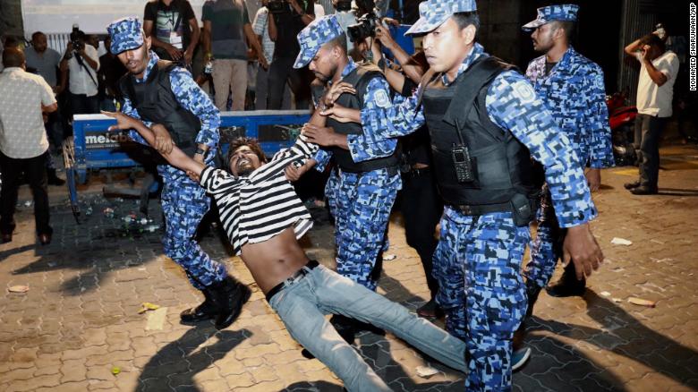 Lực lượng an ninh Maldives bắt người phản đối hôm 5.2. Photo Courtesy: Reuters Bộ Ngoại giao Việt Nam chiều ngày 6.2 đã phát đi thông khuyến cáo công dân không nên đến Maldives sau khi chính phủ nước này ban bố tình trạng khẩn cấp do khủng hoảng chính trị.