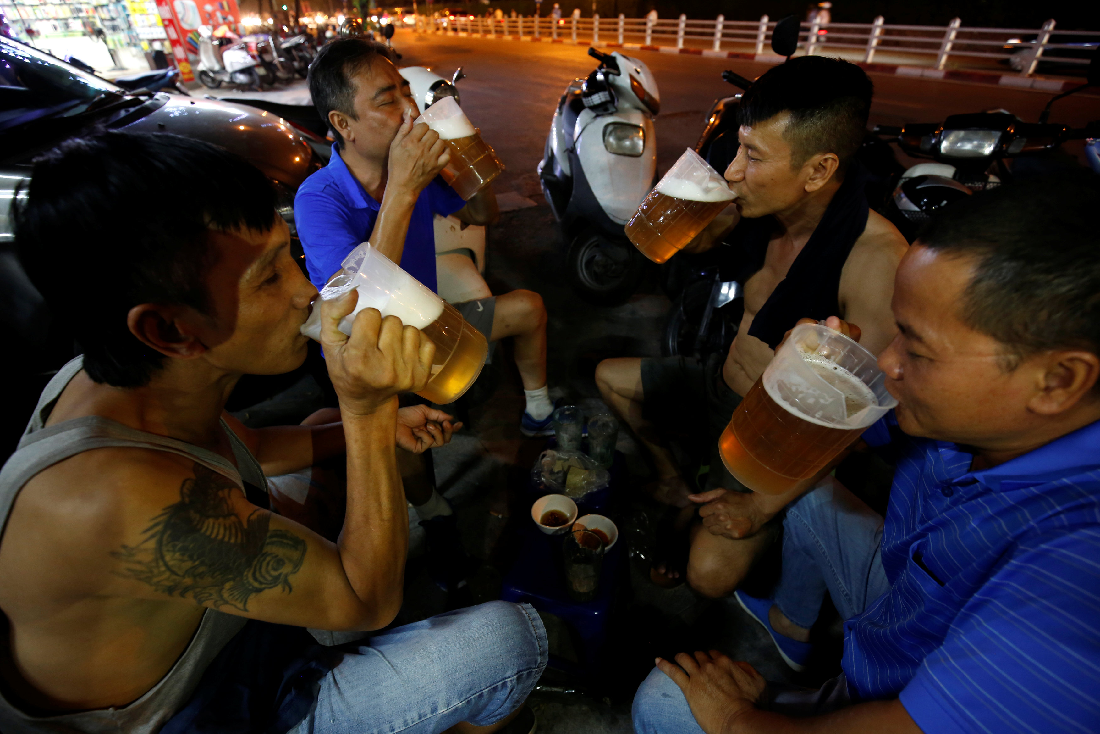Một nhóm người đàn ông ngồi uống bia ở đường phố Hà Nội hôm 3.10.2018. Photo Courtesy: Reuters Trung bình cứ 100,000 người Việt thì có 23,2 người bị ung thư gan, thuộc nhóm nước mắc ung thư gan cao nhất thế giới.