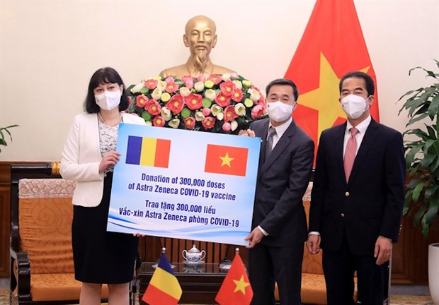 Thứ trưởng Ngoại giao Tô Anh Dũng và Thứ trưởng Y tế Trần Văn Thuấn chụp hình cùng Đại sứ Romania tại VN Cristina Romila trong lễ nhận 300.000 liều vắc-xin AstraZeneca do Romania tặng hôm 25/8/2021 tại Hà Nội. Photo courtesy: VNA/VNS Việt Nam vừa tiếp nhận thêm 300.000 liều vắc-xin ngừa COVID-19 của hãng AstraZeneca do Chính phủ Romania trao tặng và ký kết hiệp định nhận viện trợ không hoàn lại trị giá 2,75 triệu đô la của Ngân hàng Thế giới (World Bank) cho một dự án đối phó đại dịch. Truyền thông Nhà nước loan tin này hôm 25/8.