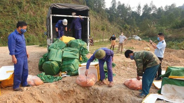 Cơ quan chức năng tiêu hủy trứng non nhập lậu từ Trung Quốc. Photo courtesy: Báo Hải Quan Trong hai ngày 11 và 12 tháng 3, Hải quan Lào Cai đã phát hiện bắt giữ hơn 1,2 tấn trứng gia cầm non đông lạnh nhập lậu từ Trung Quốc. Báo trong nước đưa tin hôm 13 tháng 3.