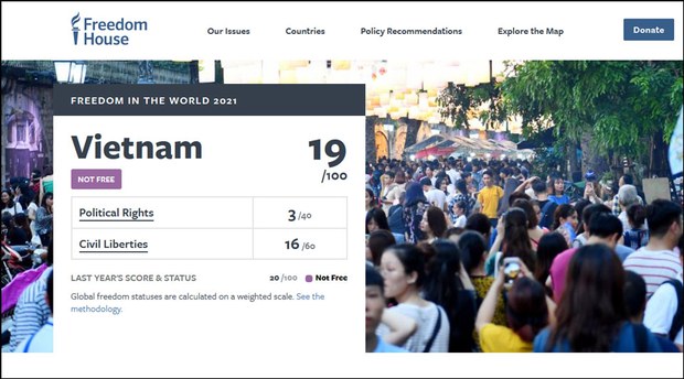 Việt Nam tiếp tục thuộc nhóm quốc gia không có quyền tự do theo báo cáo Tự do trên Thế giới năm 2021 mà tổ chức Freedom House công bố vào ngày 3 tháng 3. Photo courtesy: Freedom House