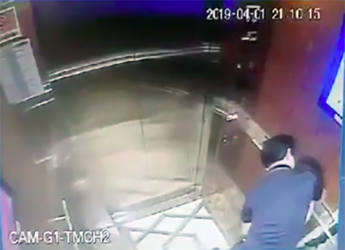 Ngay khi cửa thang máy đóng lại, ông Linh buông điện thoại, ôm ghì bé gái. Cô bé tỏ vẻ sợ sệt khi bị ông này ôm ghì.