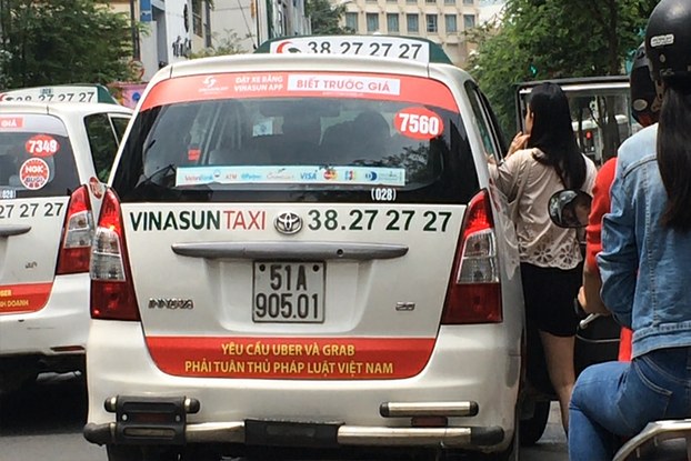 Vinasun taxi với decal phản đối grab và uber. Photo courtesy: RFA Báo cáo công bố tài chính quý 2/2020 của Công ty cổ phần Ánh Dương (taxi Vinasun) và Công ty cổ phần lọc hóa Dầu Bình Sơn (BSR) cho thấy hai doanh nghiệp này đang đối mặt với thiệt hại nặng nề vì ảnh hưởng của dịch Covid-19.