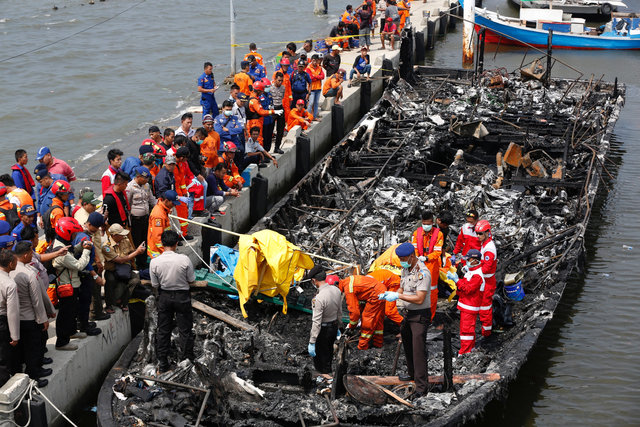 Police and rescue workers search a boat for victims at Muara Angke port in Jakarta, Indonesia. (Photo: Reuters) Twenty three people have been killed and dozens injured after a fire ripped through a boat carrying nearly 250 people to islands north of the Indonesian capital Jakarta, the city’s search and rescue agency said.