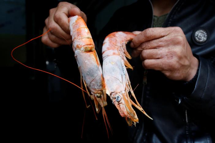 An employee poses with what he says are contaminated decomposed shrimps at a frozen food storage facility in Vietnam’s central Ha Tinh province April 1, 2017. (Photo: Reuters)