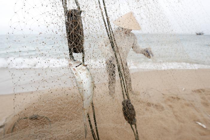 A woman collects fish on the beach of Dong Yen fishing village. (Photo: Reuters)