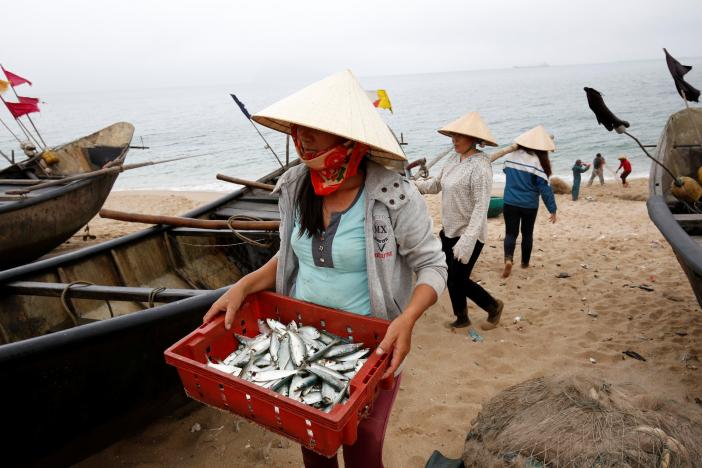 A woman carries fish on the beach of Dong Yen fishing village, which is next to the Formosa factory, in Vietnam’s central Ha Tinh province March 31, 2017. (Photo: Reuters) QUANG TRI – “The big fish are all dead,” complained 50 year-old Mai Xuan Hoa, picking small fish from a net as he tried to rebuild his livelihood a year after Vietnam‘s worst environmental disaster.