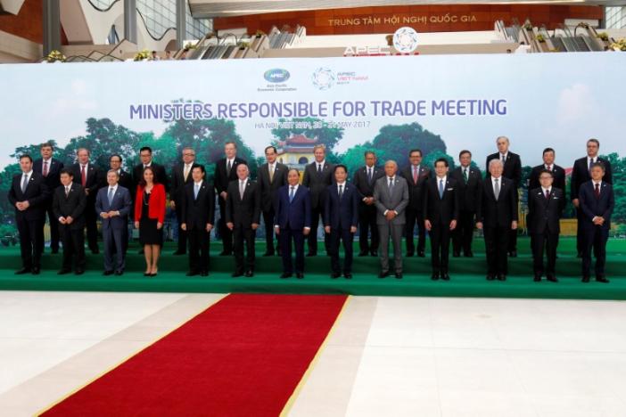Vietnam’s Prime Minister Nguyen Xuan Phuc (C, front) poses for a photo with APEC trade ministers during the APEC Ministers Responsible For Trade (APEC MRT 23) meeting in Hanoi, Vietnam May 20, 2017. (Photo: Reuters)