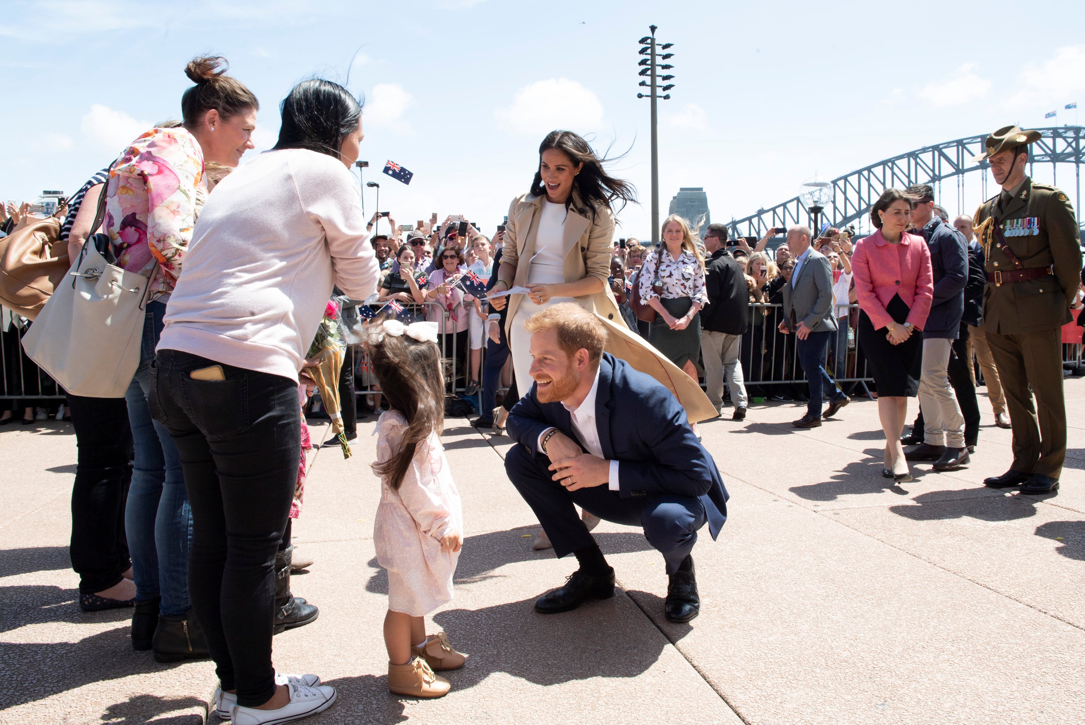 The royal couple began their official tour of Australia with a ferry ride across the harbour to greet cheering crowds packed in front of the Opera House, which was opened by Harry’s grandmother, Queen Elizabeth, 45 years ago.
