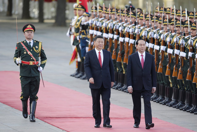 Vietnam’s President Tran Dai Quang (R) and China’s President Xi Jinping inspect honour guards during a welcoming ceremony outside the Great Hall of the People, in Beijing, China May 11, 2017. (Photo: Reuters) BEIJING – The leaders of China and Vietnam have had “positive” talks about the disputed South China Sea with neither side criticising the other, a senior Chinese diplomat said.