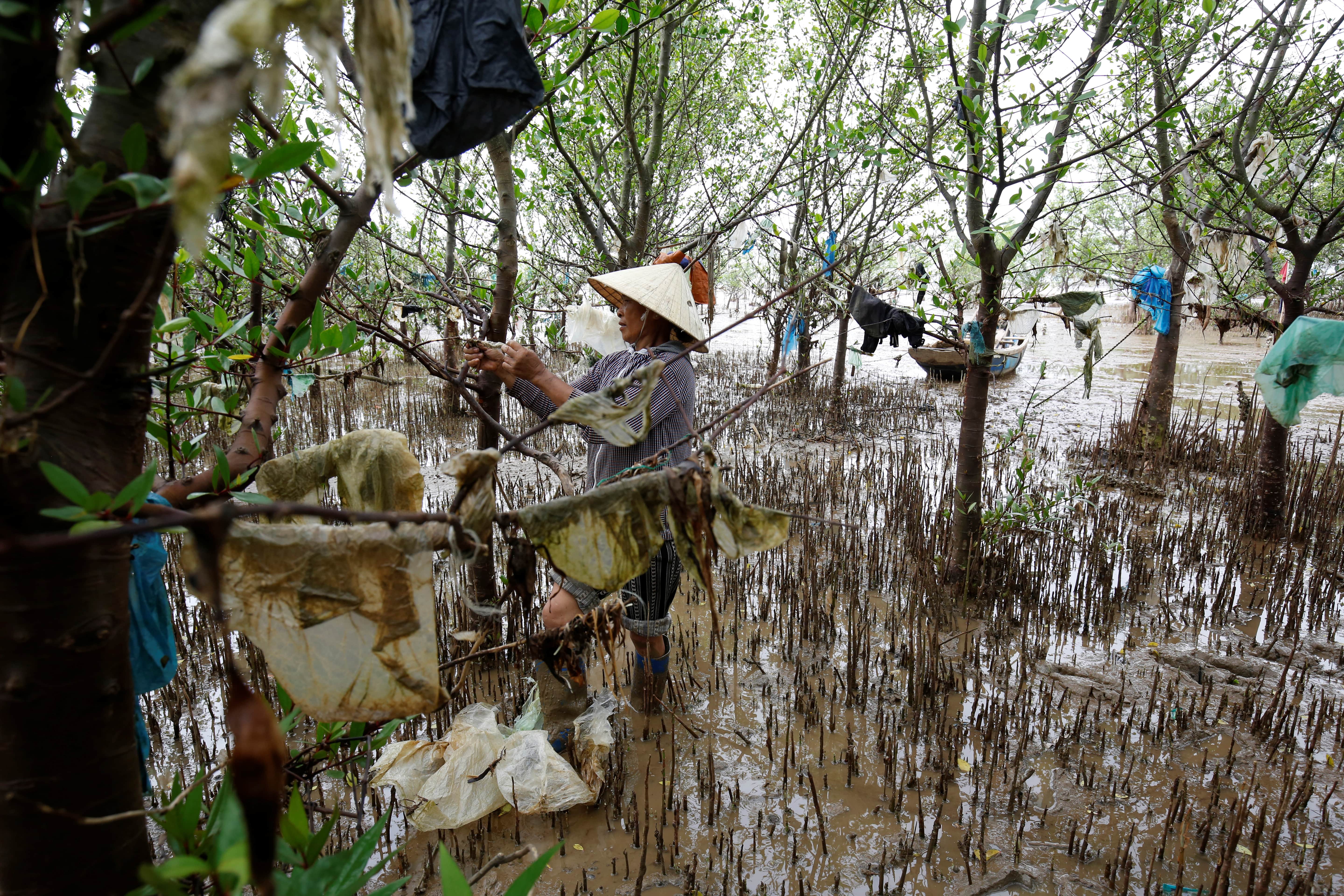 A woman removes plastic waste stuck in tree branches near the beach in Thanh Hoa province, Vietnam June 4, 2018. (Photo: Reuters)