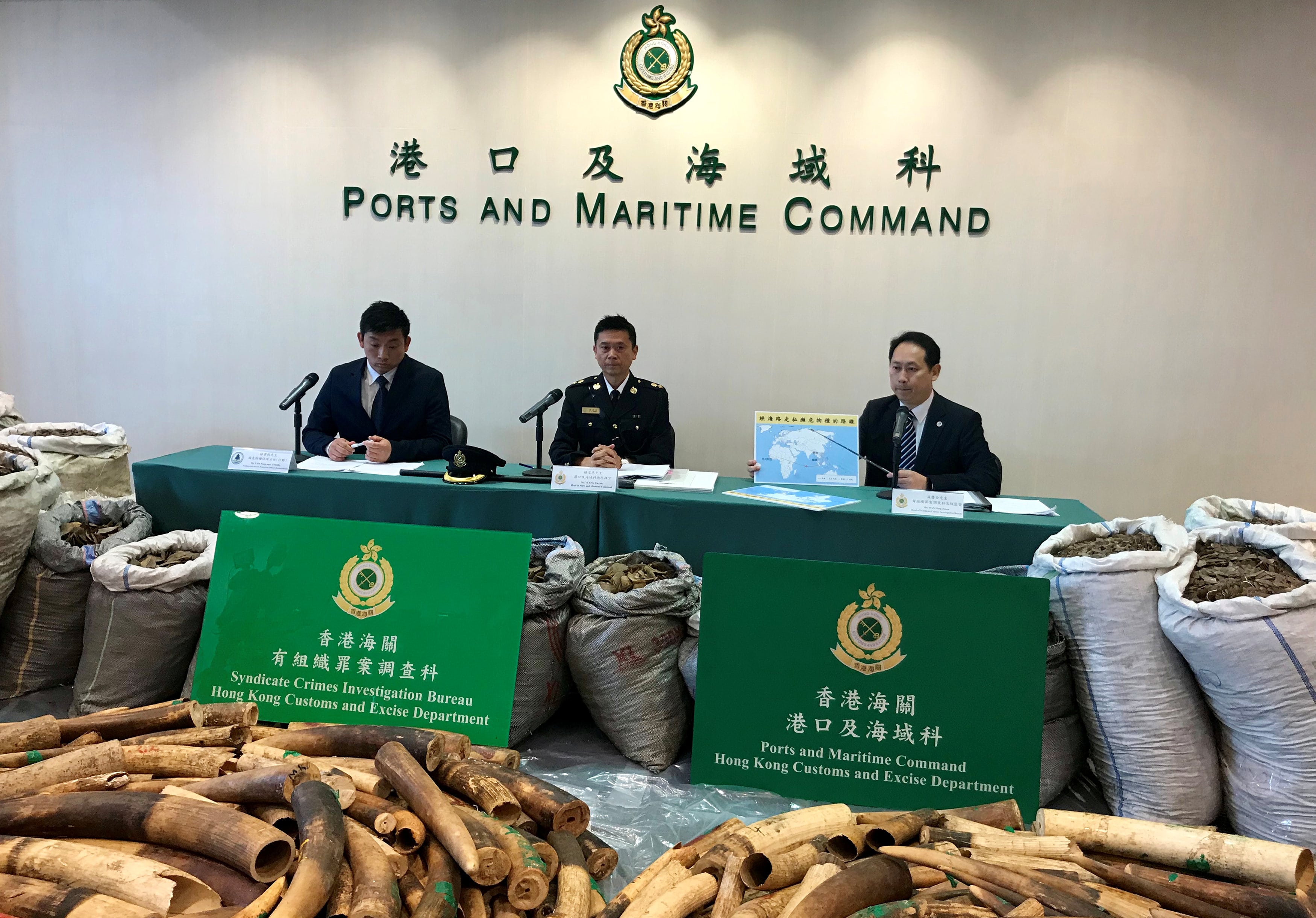 Officers attend a news conference with ivory tusks and pangolin scales, seized by Hong Kong Customs, displayed in Hong Kong, China, February 1, 2019. (Photo: Reuters)