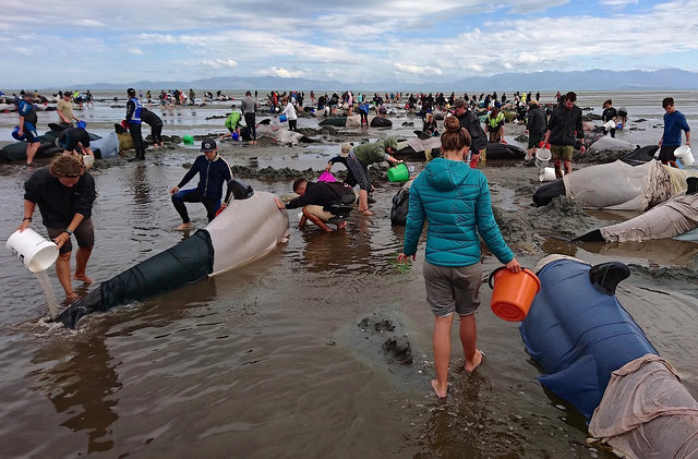 Hundreds of volunteers flocked to Golden Bay, at the northwest tip of South Island, after dawn broke and surviving whales were refloated at high tide by lunchtime, but 90 quickly became stranded once again as the tide ebbed. About 50 more lingered in shallow waters near their beleaguered pod.