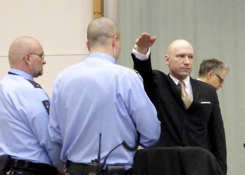 Mass killer Anders Behring Breivik raises his arm in a Nazi salute as he enters the court room in Skien prison, Norway March 15, 2016 (Photo: Reuters/File Photo)