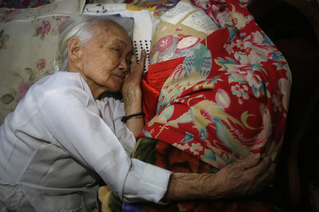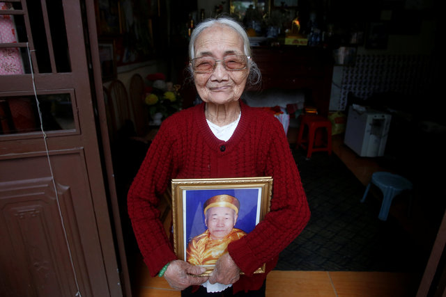 Vietnamese Nguyen Thi Xuan, 94, who married Japanese soldier Nguyen Van Duc during World War Two, poses with a portrait of him at her house in Hanoi, Vietnam February 14, 2017. (Photo: Reuters) “This is my husband,” said 94-year-old Nguyen Thi Xuan, holding up a pillow wrapped in a Vietnamese flag, with a Japanese army shirt pushed inside. She sleeps with it every night.