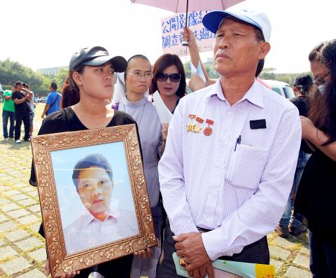 The father and sister of Vietnamese worker Nguyen Quoc Phi, who was shot and killed by a police officer in Hsinchu County last month, attend a news conference held by the Migrant Empowerment Network in Taiwan in front of the Presidential Office Building in Taipei, September 21, 2017. (Photo courtesy: CNA)
