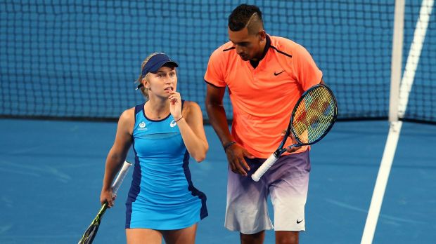 Daria Gavrilova and Nick Kyrgios of Australia talk tactics during their match against Lara Arruabarrena and Feliciano Lopez of Spain on day one of the 2017 Hopman Cup at Perth Arena. (Photo courtesy: Paul Kane/Getty Images) Earlier, 21-year-old Kyrgios had beaten Pavlasek 7-5 6-4 in the singles, meaning the pressure was on his Russian-born Australian team-mate.