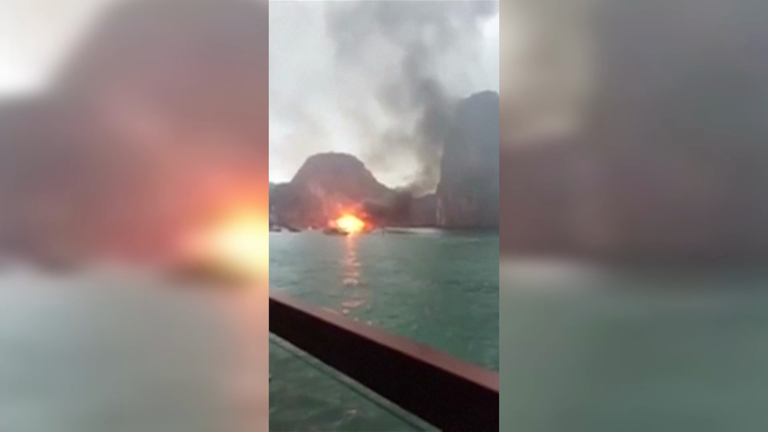Tourist boat catches fire at Vietnam Unesco world heritage site. (Photo screenshot via Reuters)